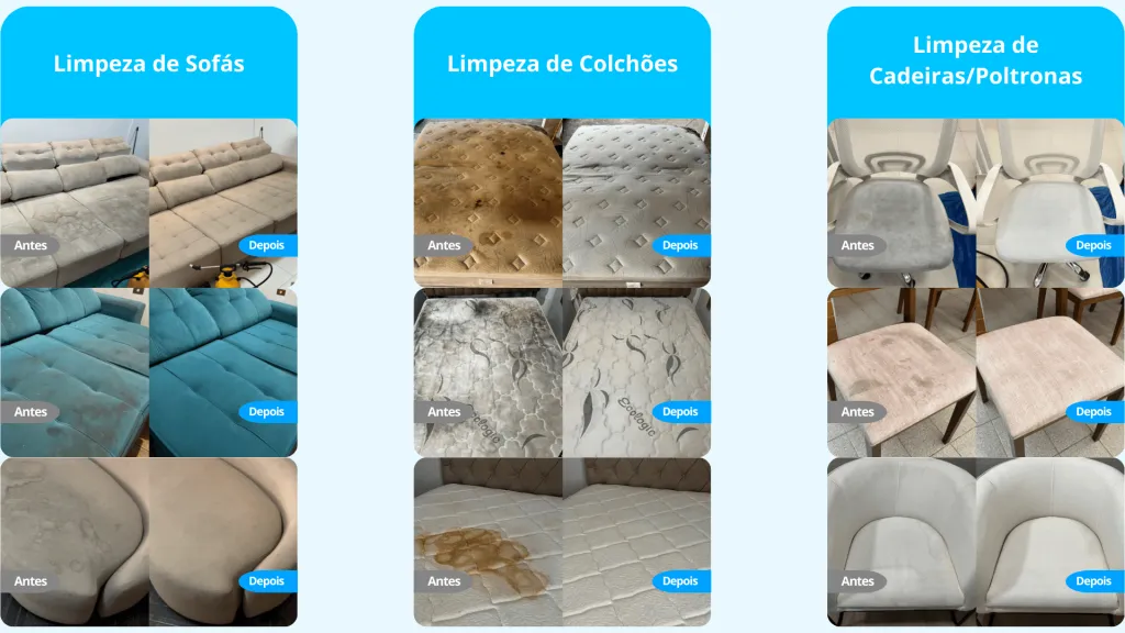 Processo que remove sujeira, manchas e elimina ácaros e bactérias, deixando o estofado limpo e cheiroso.