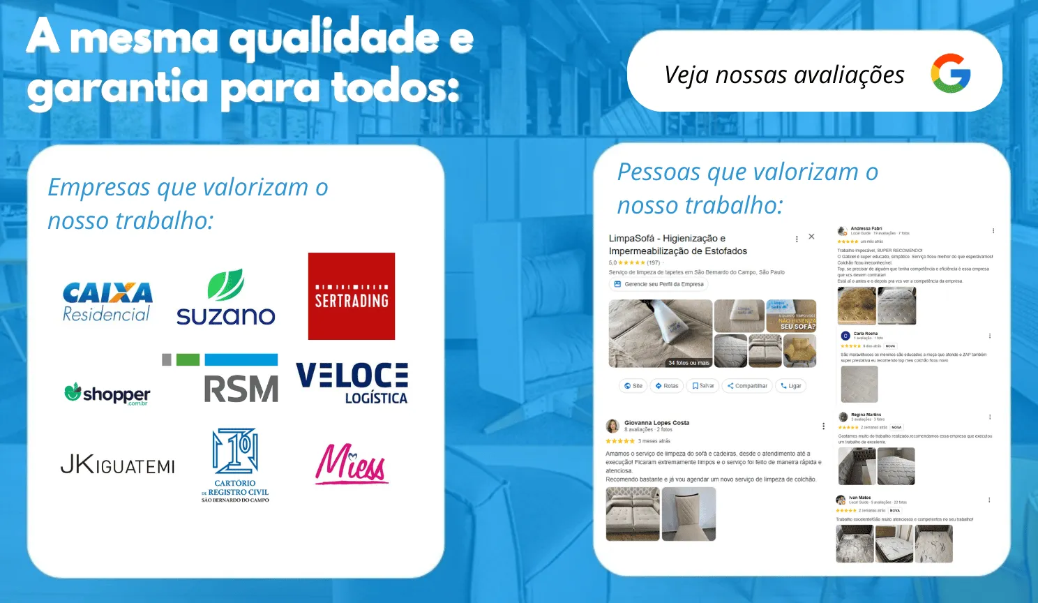 EXCELENTE Com base em 255 avaliações Kelly Garcia03/08/2025Trustindex verifica se a fonte original da avaliação é Google. Foi incrível😮 saio toda a sujeira do meu colchão e ficou bem cheiroso. Natalia Paceli01/08/2025Trustindex verifica se a fonte original da avaliação é Google. Serviço excelente! São rápidos desde o orçamento, agendamento e até no procedimento. Fazem tudo com muito capricho e atento aos detalhes. Os meninos são extremamente atenciosos e simpáticos. Nós amamos o resultado! Vale muito a pena! Vanessa Tieme28/07/2025Trustindex verifica se a fonte original da avaliação é Google. Servico impecável e atendimento ainda melhor! Foram indicados no grupo do meu condominio, e vou seguir indicando mais. Maravilhosos! valeria vilela28/07/2025Trustindex verifica se a fonte original da avaliação é Google. Excelente trabalho, o sofá ficou impecável! Pode contratar sem medo! Juliana Lubeck25/07/2025Trustindex verifica se a fonte original da avaliação é Google. Atendimento impecável desde a venda até a realização dos serviços, muita qualidade, com resultados até superiores ao que esperávamos! Sandra Antunes25/07/2025Trustindex verifica se a fonte original da avaliação é Google. Contratamos a empresa LimpaSofá Brasil e, desde o primeiro contato, fomos muito bem atendidos. Eles realizaram a higienização e a impermeabilização do meu sofá com todo o cuidado necessário, considerando que ele já tem alguns anos de uso e o tecido está um pouco desgastado. Durante o processo, ocorreu um pequeno acidente, mas a equipe agiu com rapidez e profissionalismo para resolver a situação — e o resultado final ficou até melhor do que eu esperava. O sofá ficou limpo, cheiroso e com aparência de novo! Recomendo o serviço, pois é feito com muito capricho, atenção e responsabilidade. Larissa Santos24/07/2025Trustindex verifica se a fonte original da avaliação é Google. Serviço excelente! Encontramos a empresa através do Google e pelas recomendações e avaliações, é tudo o que esperávamos. O Lucas e o Matheus nos atenderam com muita simpatia, serviço rápido e eficiente. Atendeu demais as nossas expectativas! Com certeza seguiremos com serviços posteriores. Podem confiar e contratar sem medo Daniela Lira De Campos23/07/2025Trustindex verifica se a fonte original da avaliação é Google. Profissionais pontuais, atenciosos e eficientes, realizaram a limpeza dos colchões que ficaram limpos e livres de manchas. O custo benefício é muito bom e o atendimento/agendamento do serviço pelo WhatsApp é excelente!!! Recomendo esta empresa pelo profissionalismo e eficiência. Paloma Costa22/07/2025Trustindex verifica se a fonte original da avaliação é Google. Atendimento muito bom, desde o primeiro contato até a finalização. Serviço impecável! Podem confiar! marcia luzia milan22/07/2025Trustindex verifica se a fonte original da avaliação é Google. Excelente...